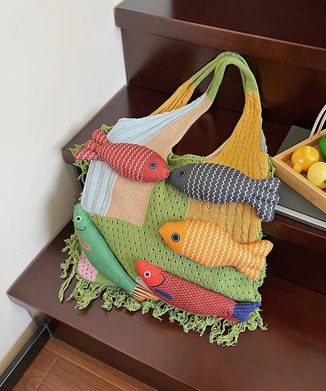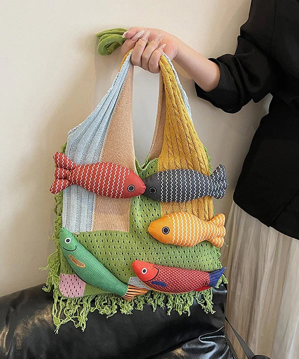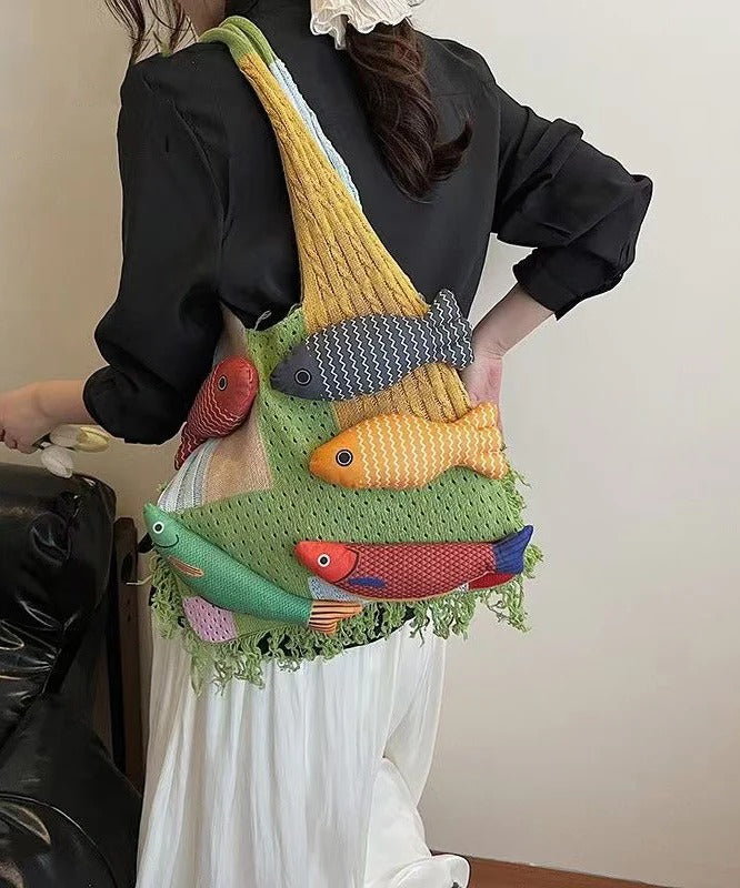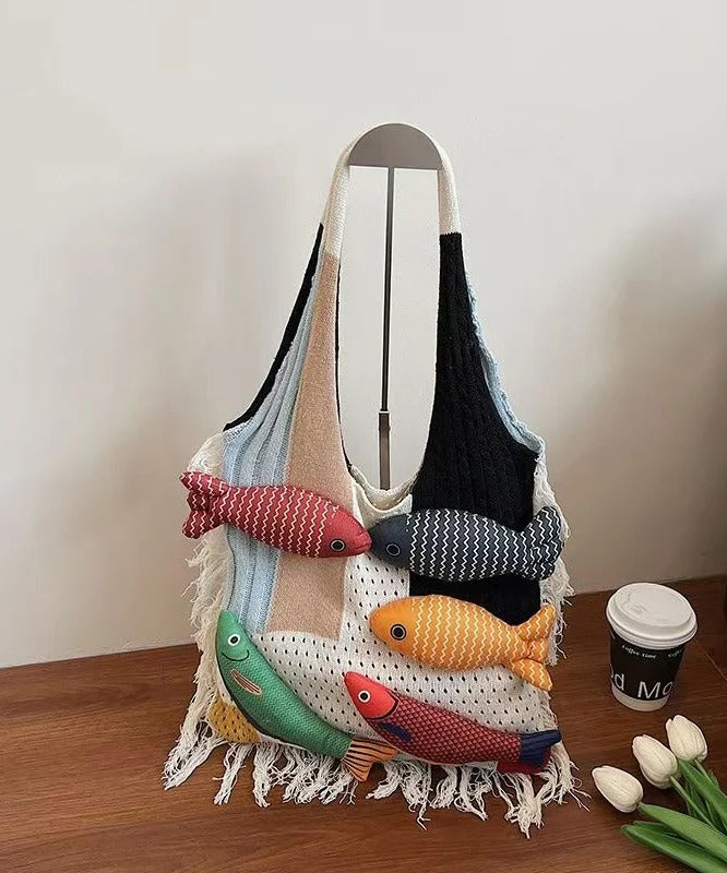 Casual Mixed Color Fish Decorated Hollow Out Cotton Shoulder Bags