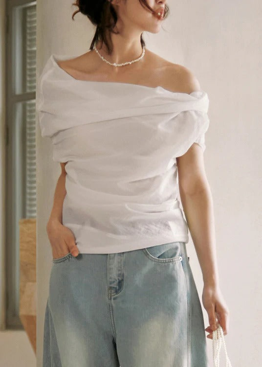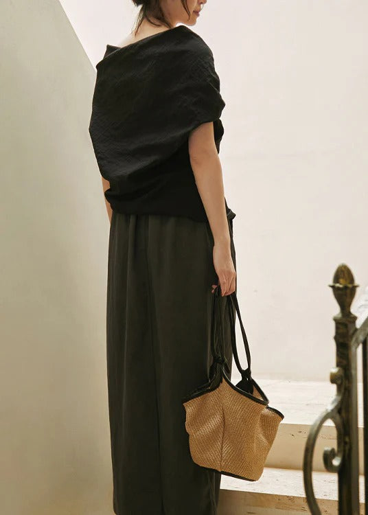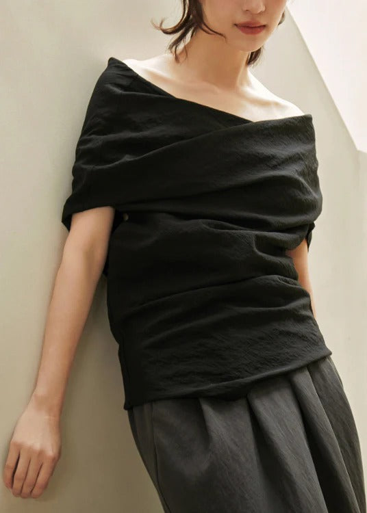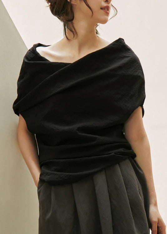 Chic Black Slash Neck Wrinkled Cotton Shirt Summer