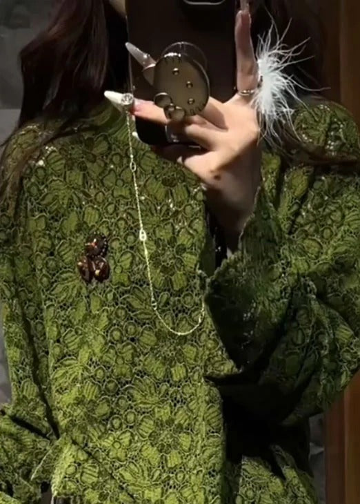 Elegant Green O Neck Hollow Out Lace T Shirts Fall