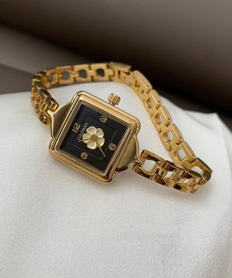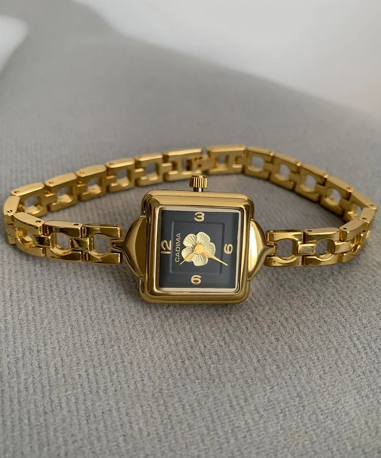 Fine Gold Metal Camellia Square Chain Tempered Glass Watch