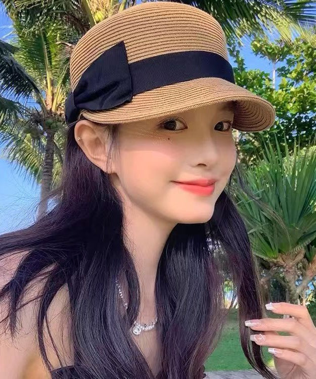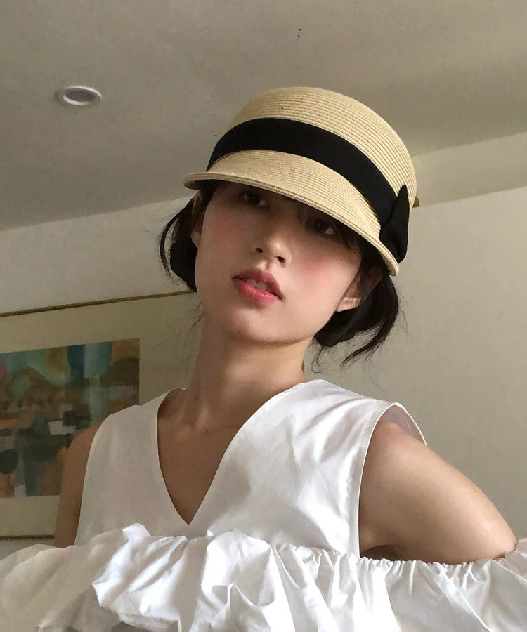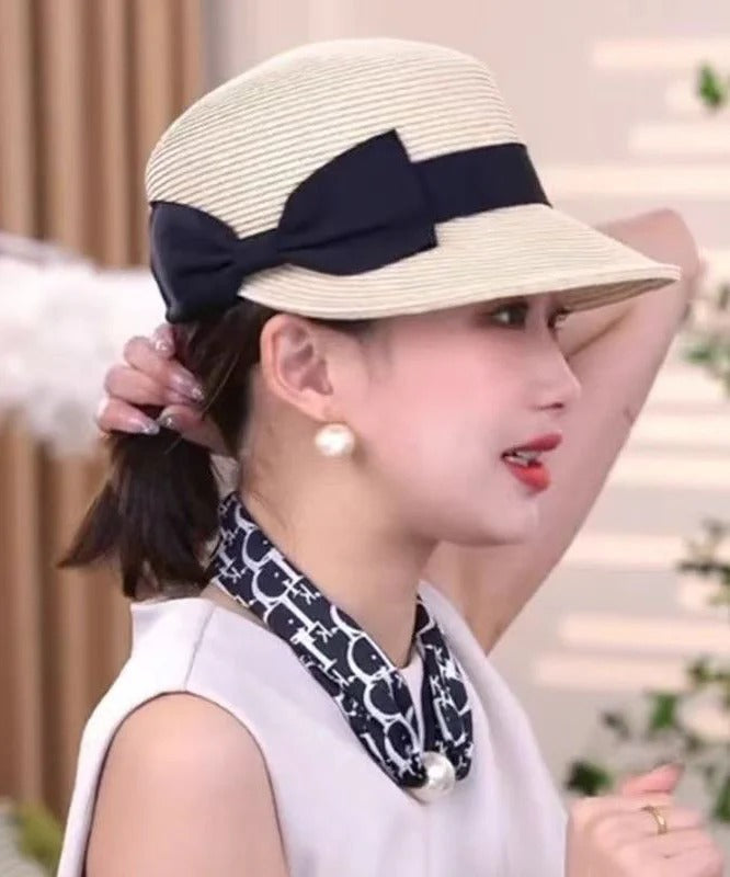 French Summer Beige Bow Straw Woven Sun Hat