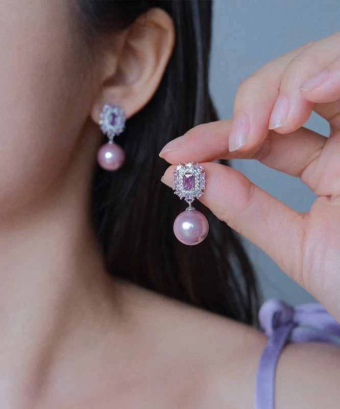 Modern Purple Copper Zircon Crystal Pearl Drop Earrings