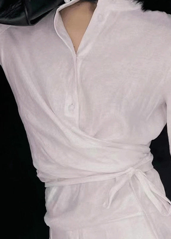 Original White Stand Collar Lace Up Linen Two Piece Suit Set Spring