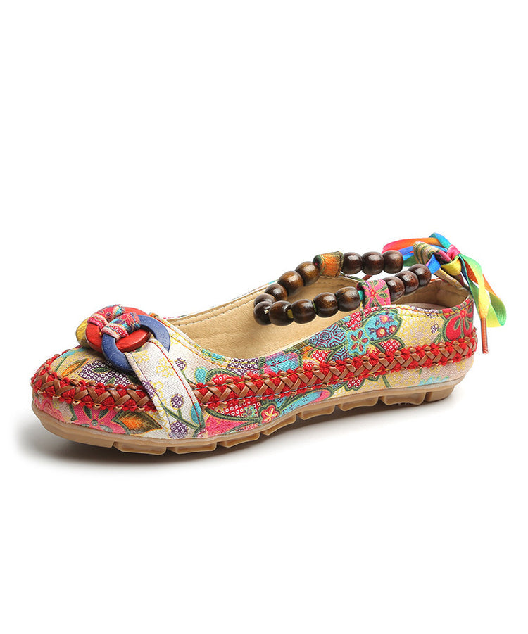 Red Linen Fabric Flat Shoes For Women Embroideried Handmade bead string Knit Fabric Flat Shoes