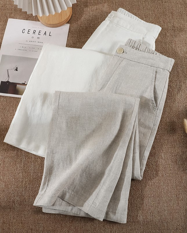 Simple White Pockets Elastic Waist Solid Linen Pants Summer