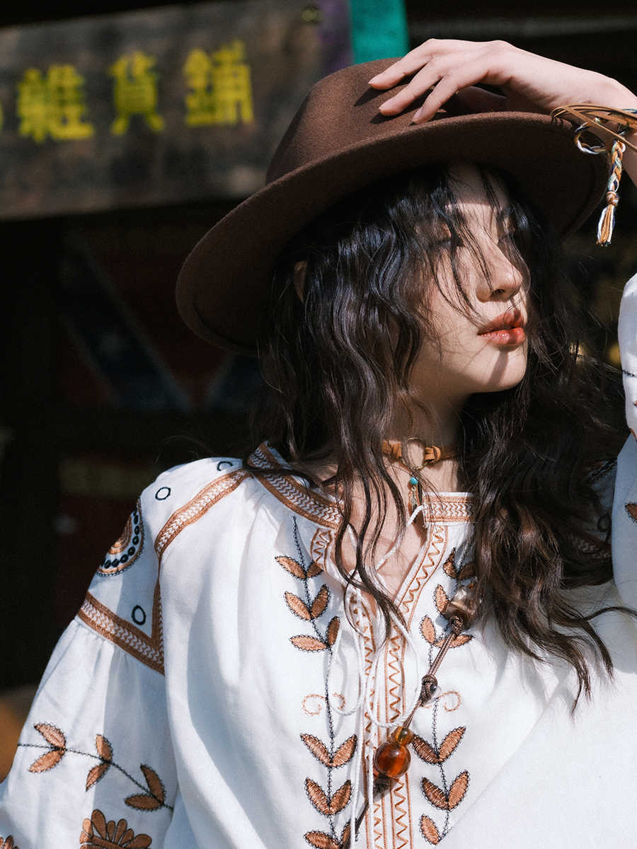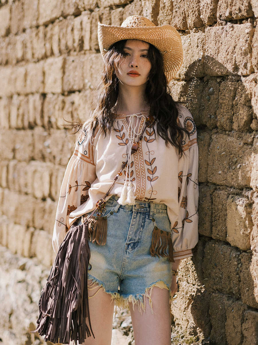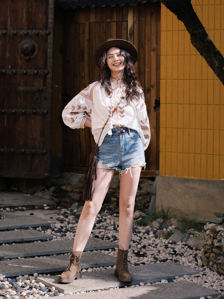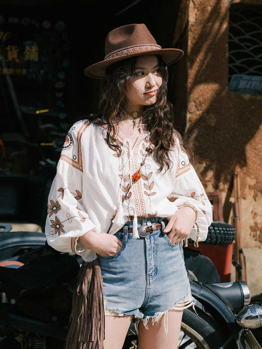 Vintage V Neck Long Sleeve Flower Pattern Linen Blouse
