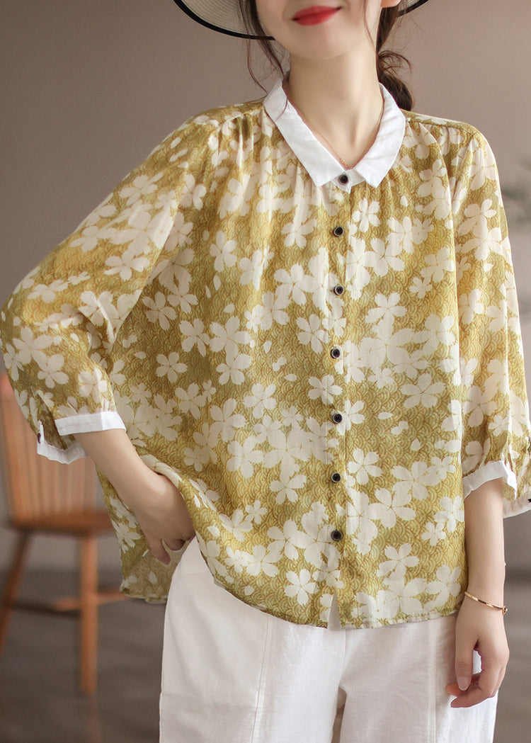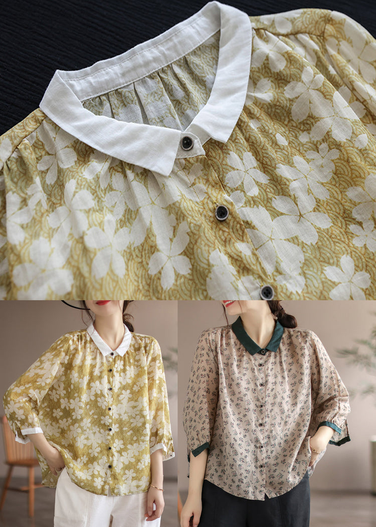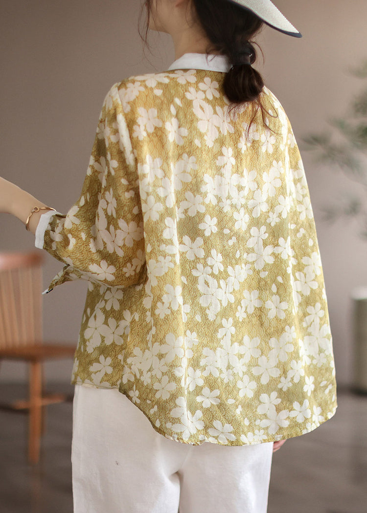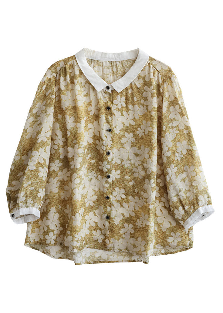Vintage Yellow Peter Pan Collar Print Linen Shirt Long Sleeve