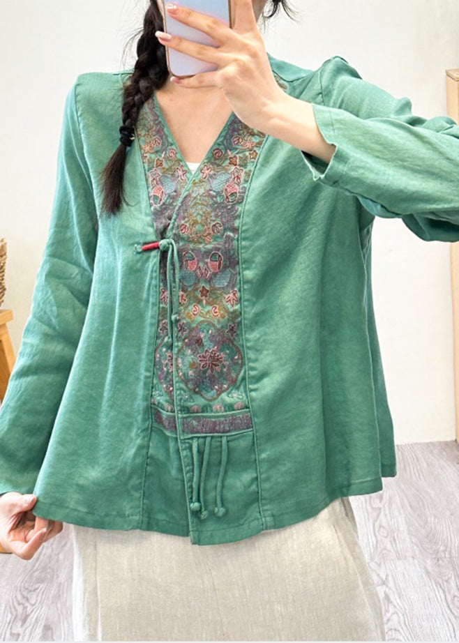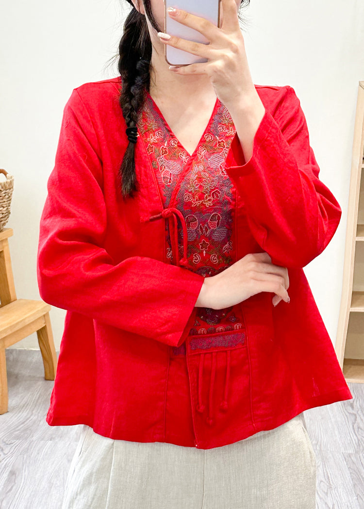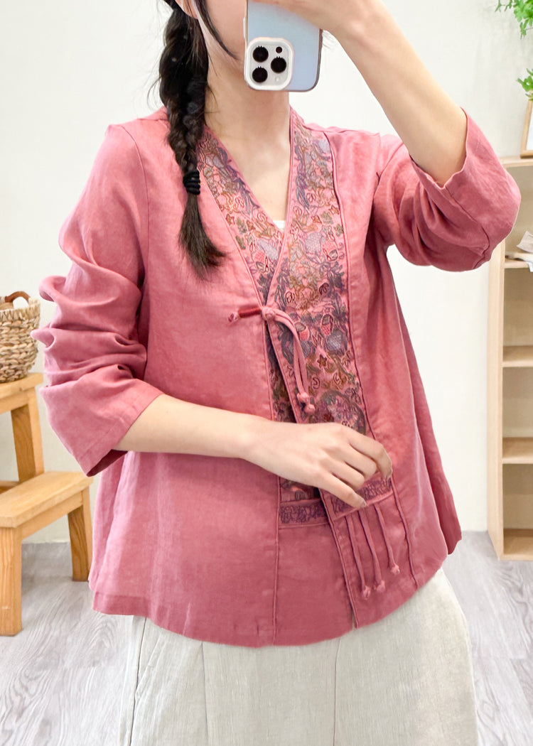 Women Pink V Neck Embroideried Floral Patchwork Linen Shirts Fall
