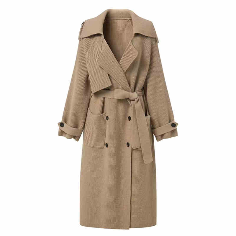2024 Fashion Grey Peter Pan Collar Pockets Tie Waist Knit Long Coats Winter
