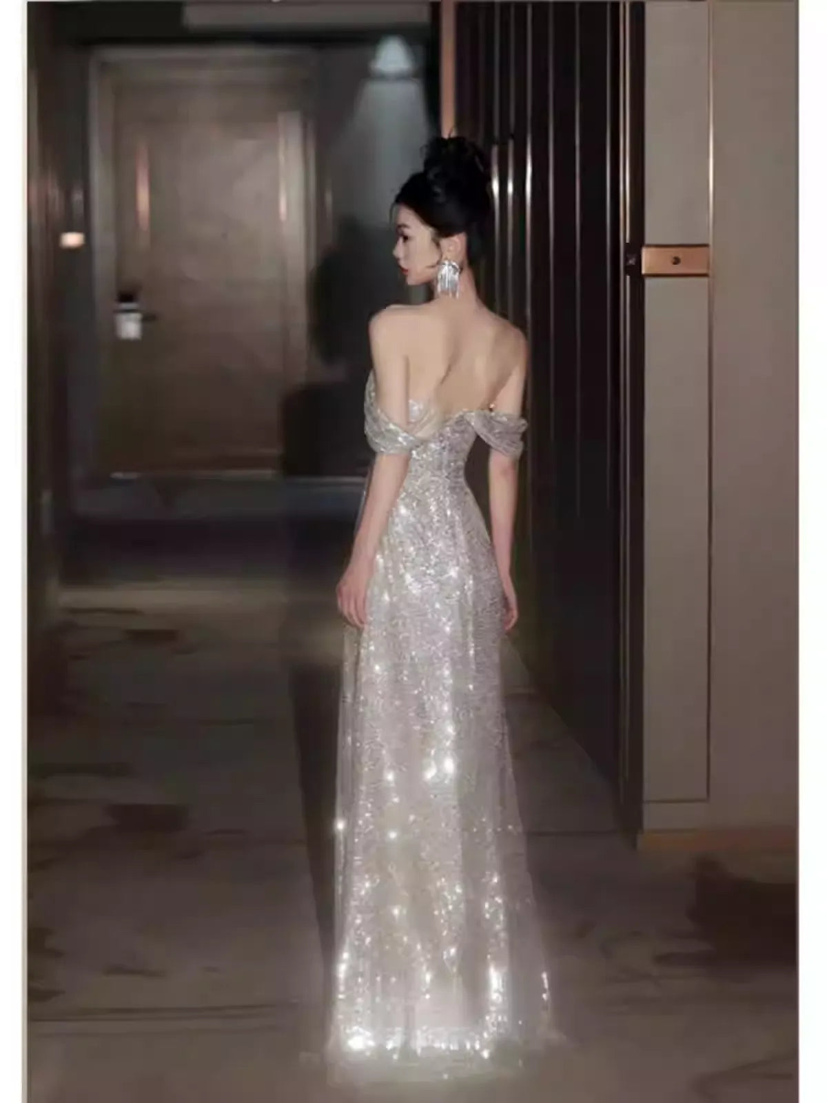2025 New Champagne Slash Neck Side Open Sequins Party Dress