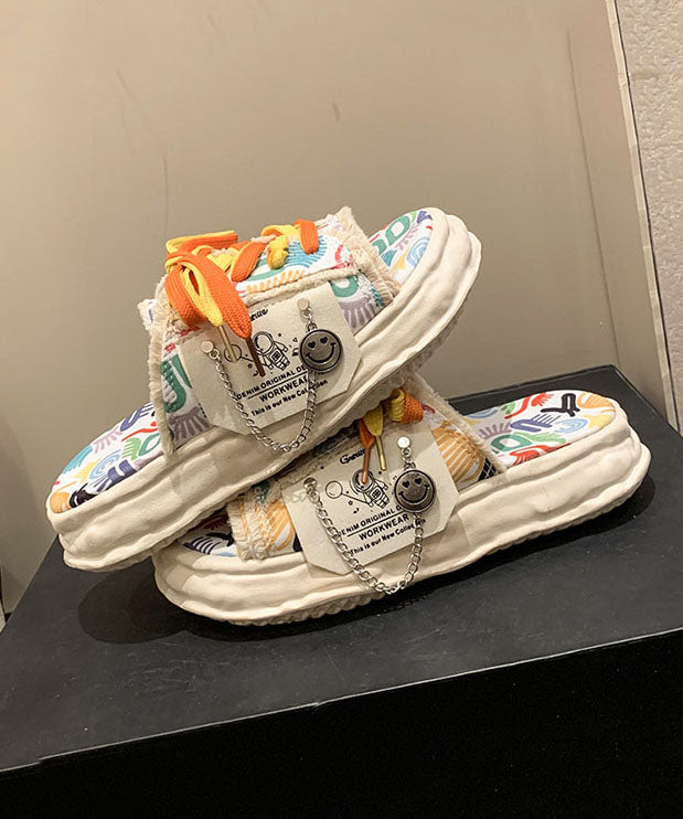 Beige Canvas Lace Up Doodle Splicing Platform Slide Sandals