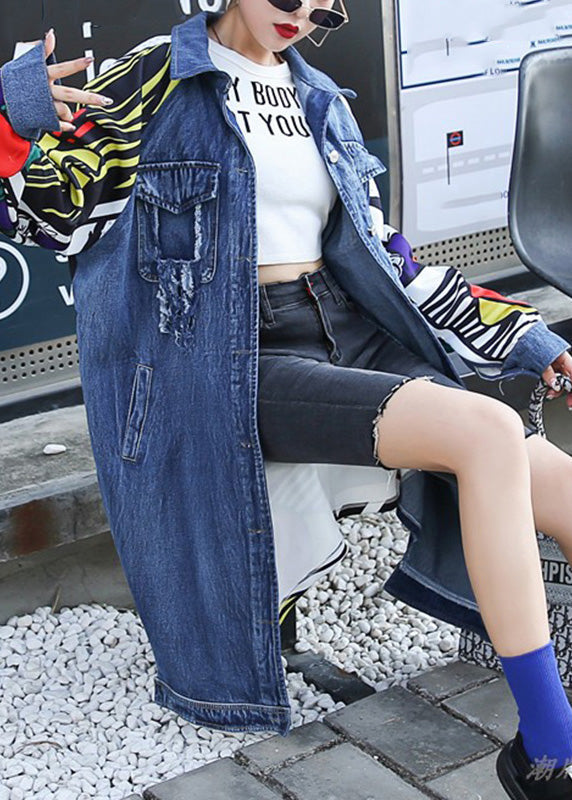 Blue Printed Peter Pan Collar Button Down Long Denim Coat Fall