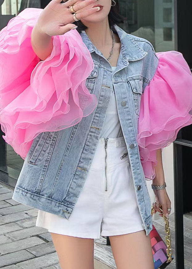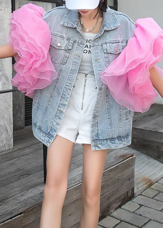Bohemian Light Blue Patchwork Tulle Ruffle Denim Top Summer