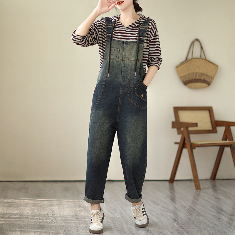 Boutique Light Blue Patchwork Distressed Denim Jumpsuit Fall
