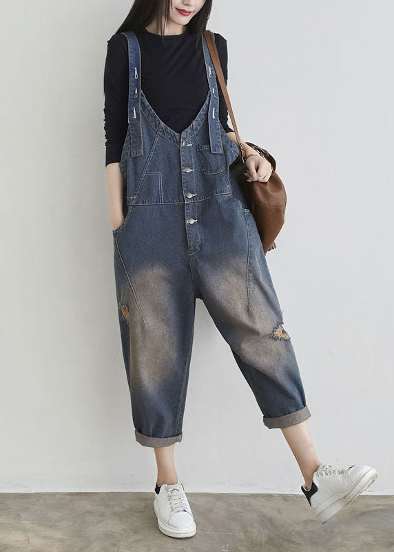 Boutique Patchwork Distressed Dark Blue Denim Jumpsuit Springing