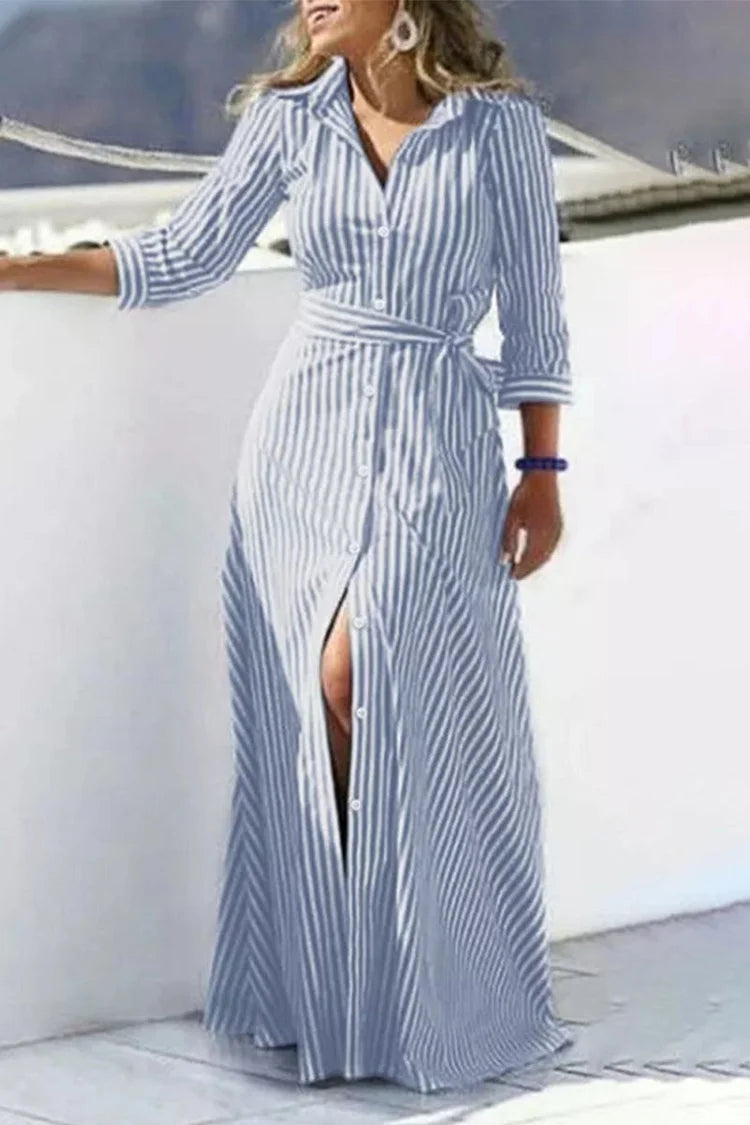 Casual Striped Print Buckle With Belt Turndown Collar Shirt Dress