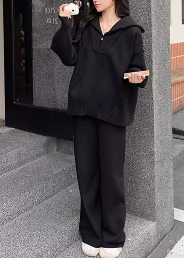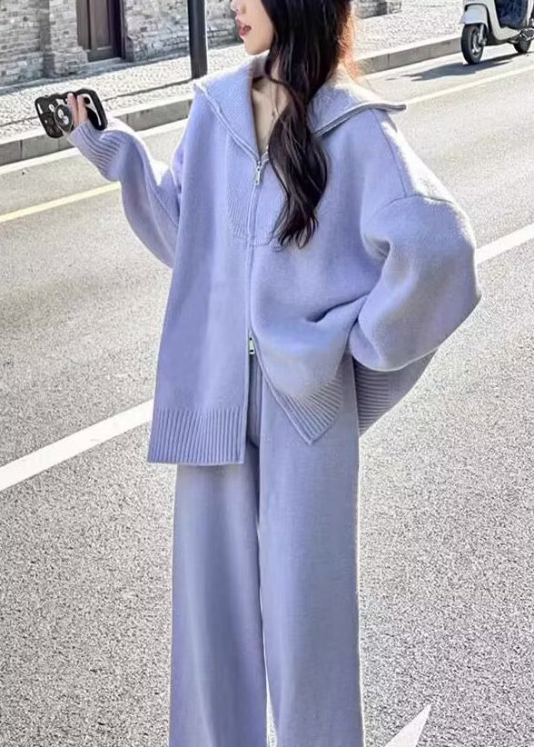 Chic Purple Zip Up Sweaters And Pants Knit Two Pieces Set Winter
