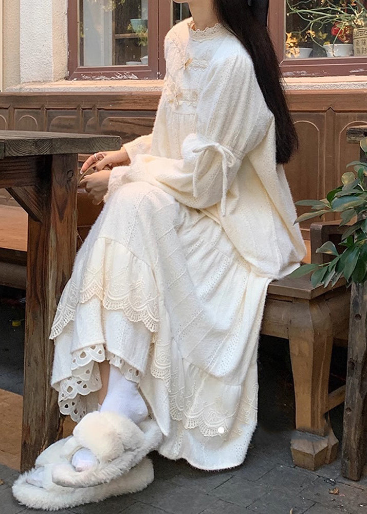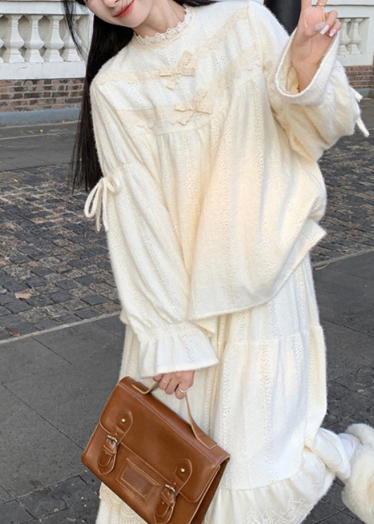 Cute Beige Lace Patchwork Tops And Skirts Cotton Two Pieces Set Spring