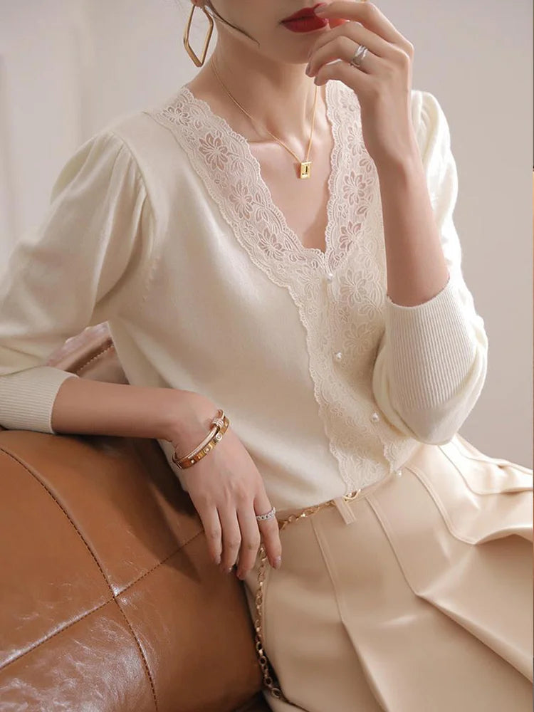 Elaine French Style V-Neck Lace Stitching Knitted Sweater