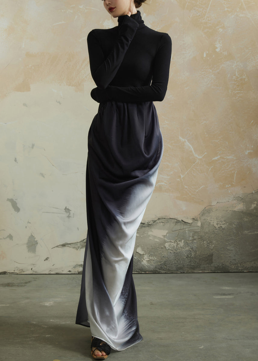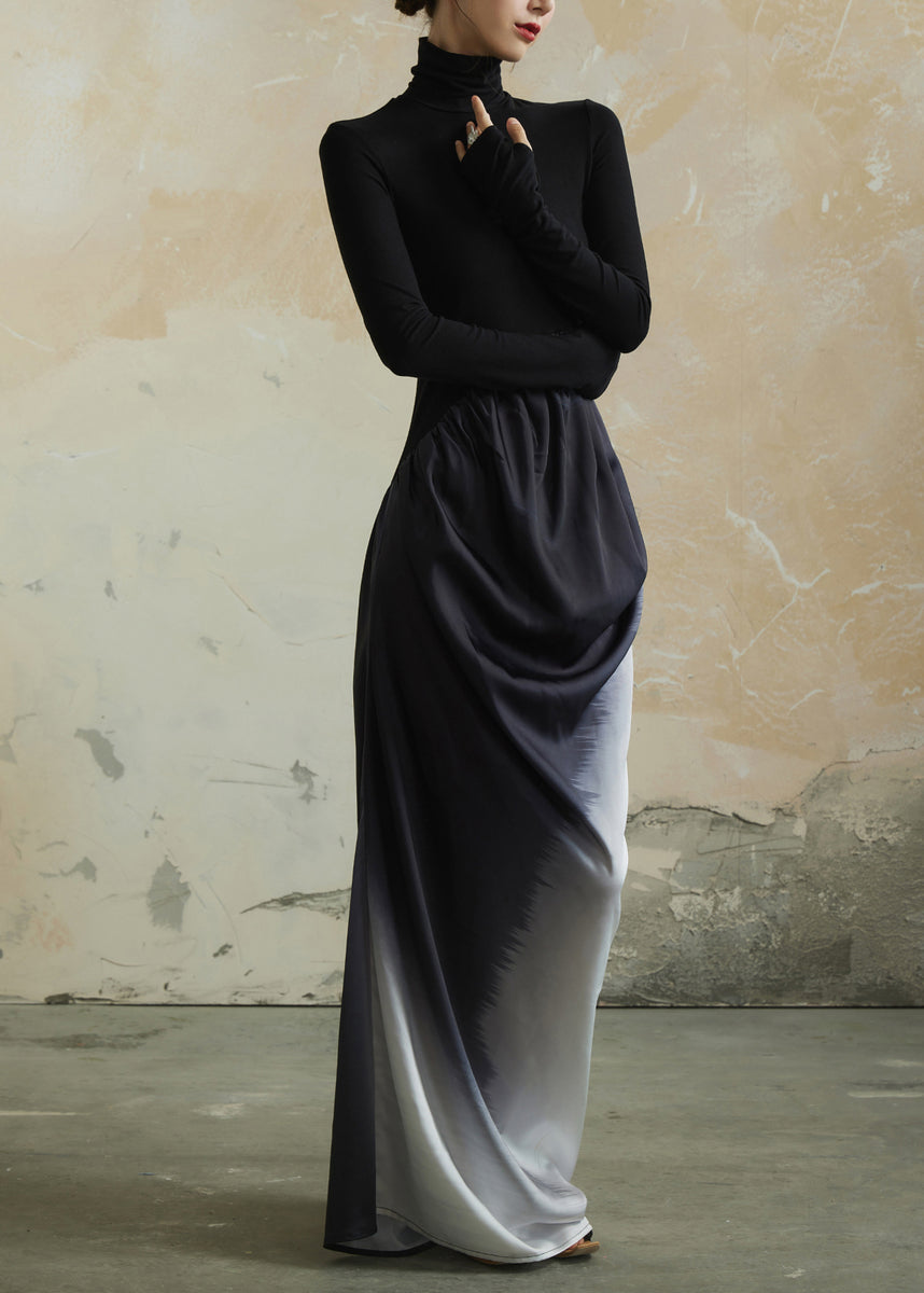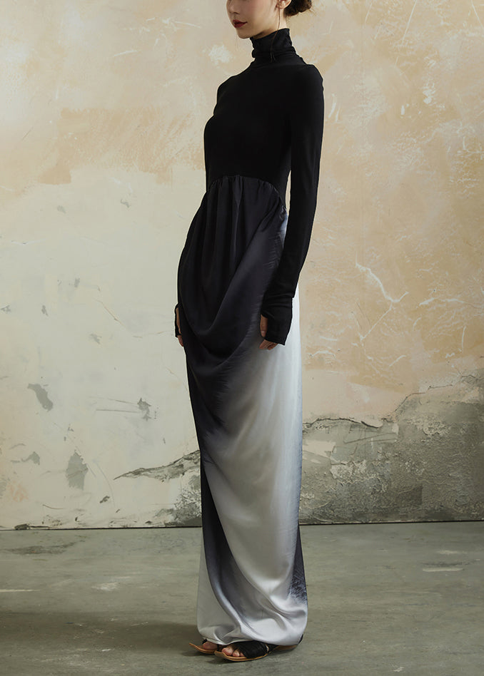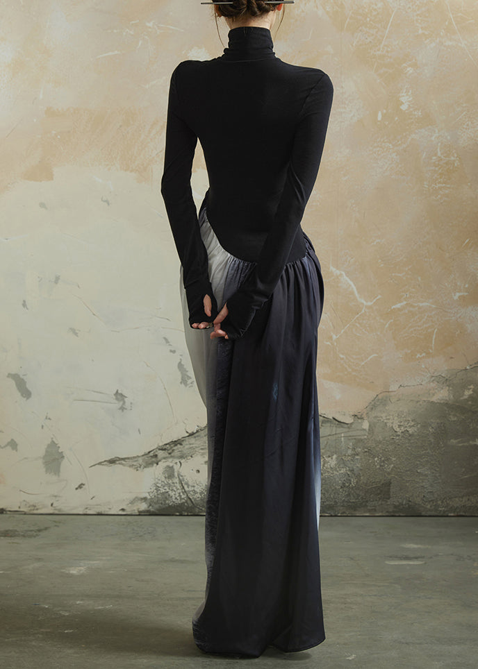Elegant Black Hign Neck Wrinkled Patchwork Cotton Dress Fall