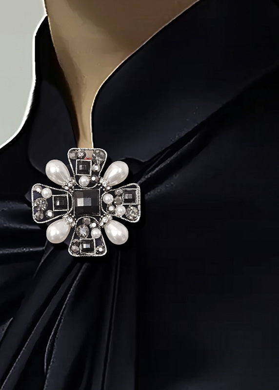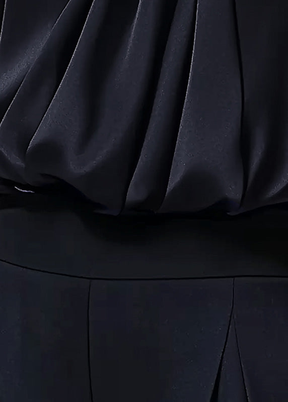 Elegant Navy Stand Collar Wrinkled Silk Shirt Top Spring