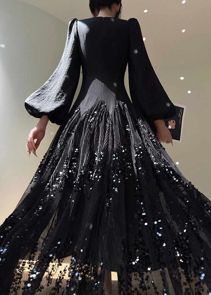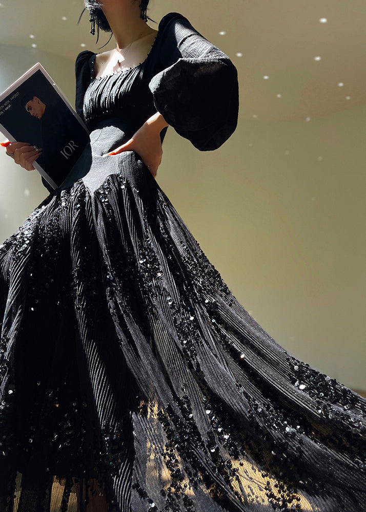 French Apricot Square Collar Sequins Asymmetrical Design Silk Dress Lantern Sleeve