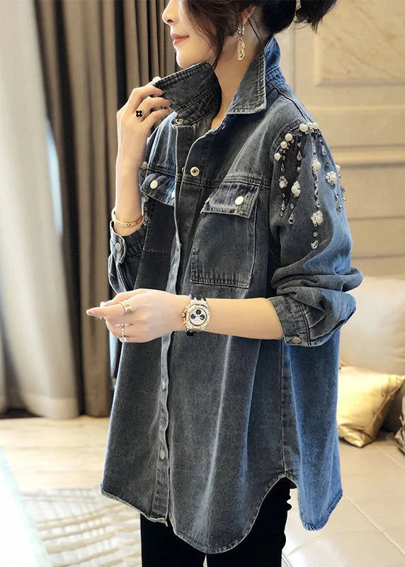 Handmade Blue Square Collar Pearl Patchwork Denim Coats Long Sleeve