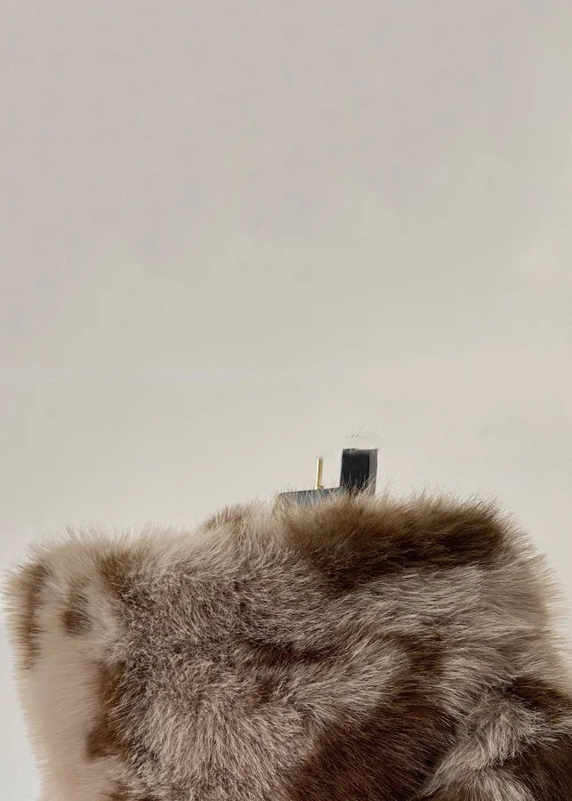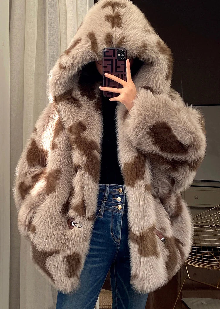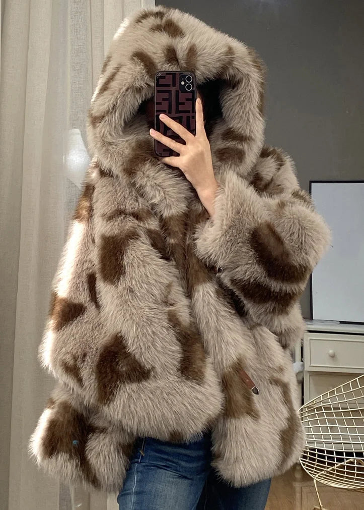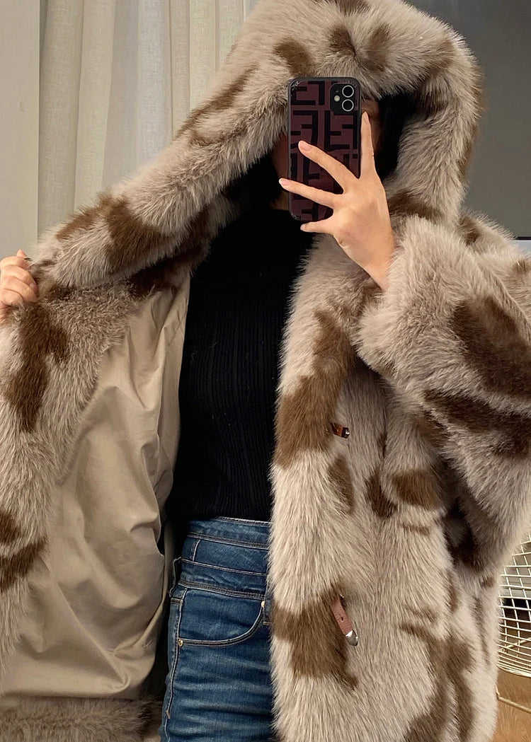 Italian Hooded Colorblock Button Pockets Fuzzy Fur Fluffy Coats Long Sleeve