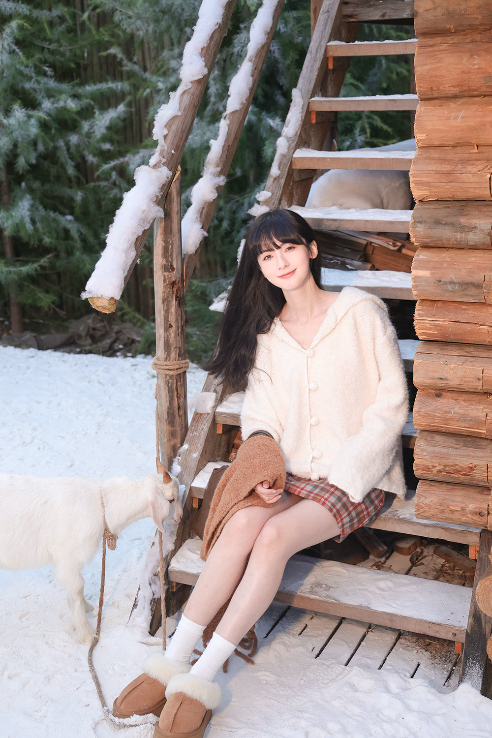 Loose Beige Hooded Button Solid Cotton Knit Coat Winter