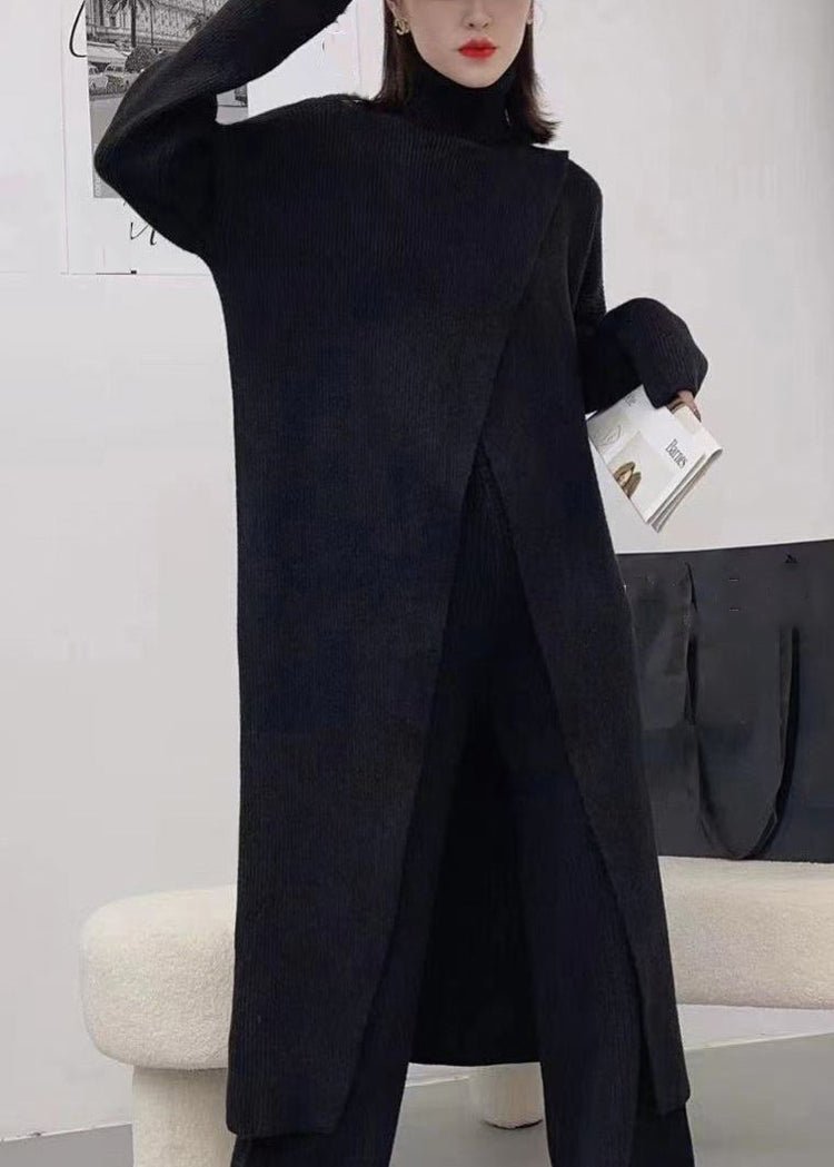 Loose Grey Turtleneck Side Open Patchwork Cotton Knit Two Pieces Set Fall