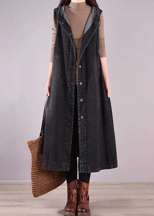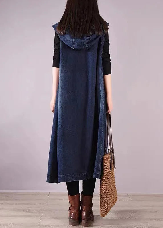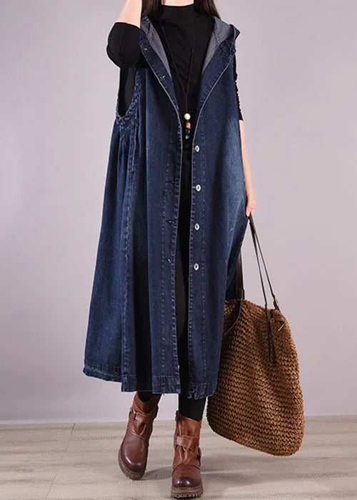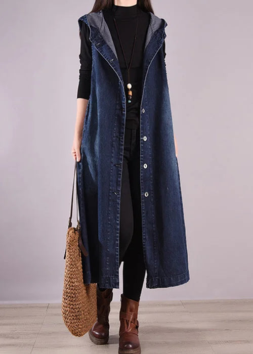 Loose Navy Hooded Button Denim Waistcoat Long Coats Sleeveless
