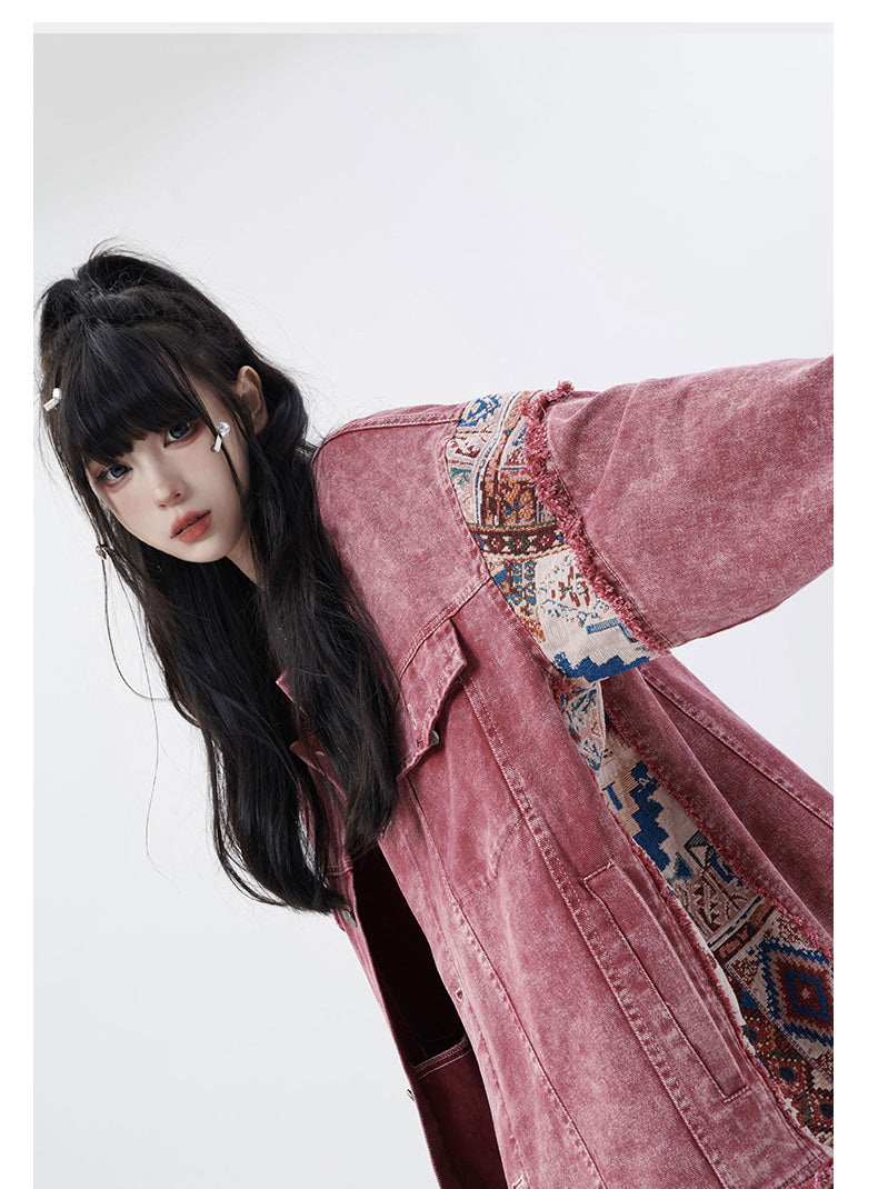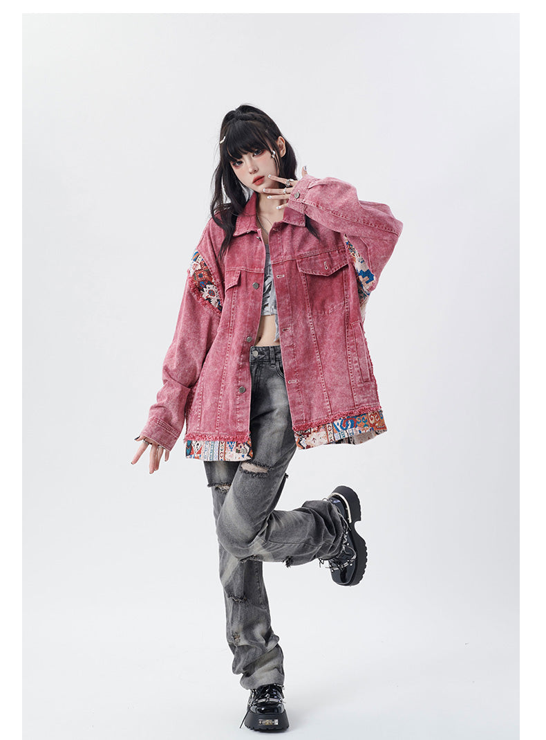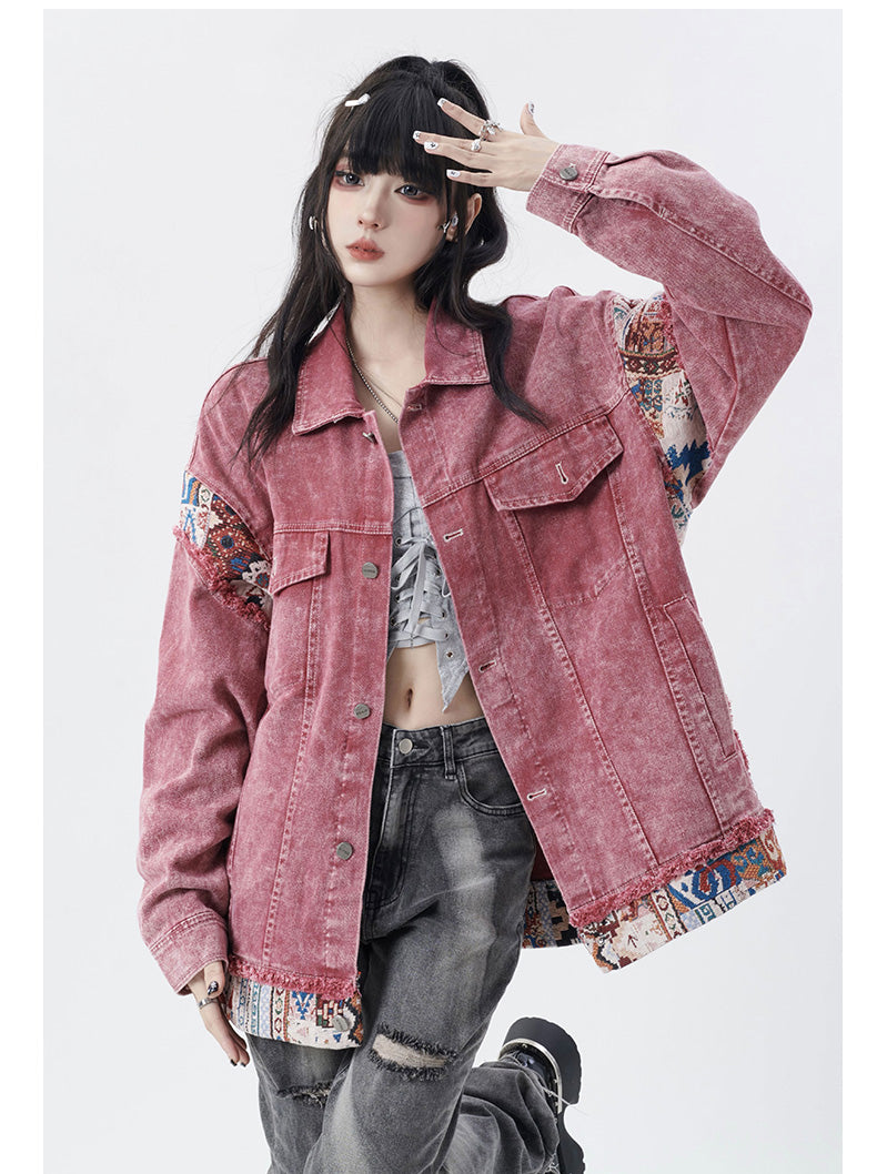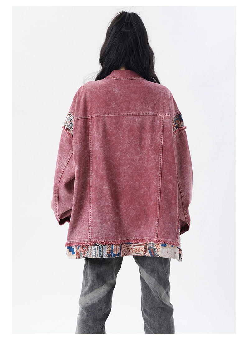 Modern Brick Red Oversized Patchwork Denim Jacket Fall