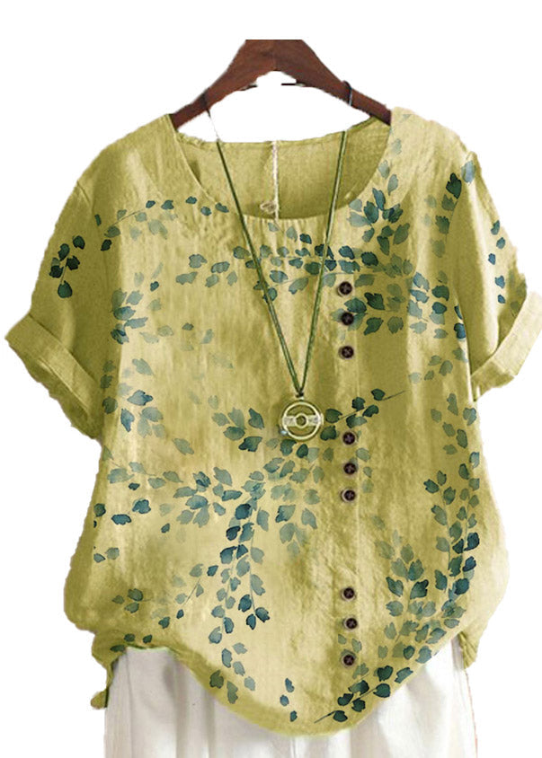 Plus Size Yellow O-Neck Embroideried Floral Linen Tops Short Sleeve