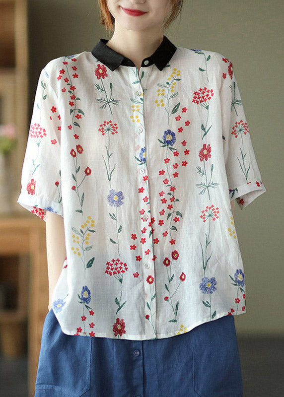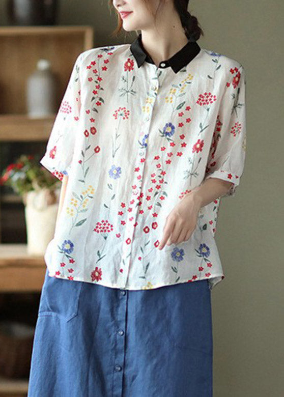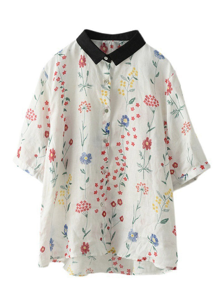 Retro Green Peter Pan Collar Print Button Linen Shirts Half Sleeve