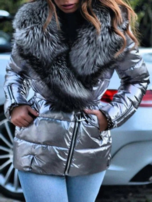 Shiny Big Fur Collar Long Sleeve Down Padded Jacket