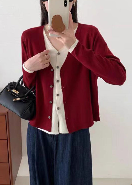 Stylish Red V Neck Button False Two Pieces Knit Cardigan Fall
