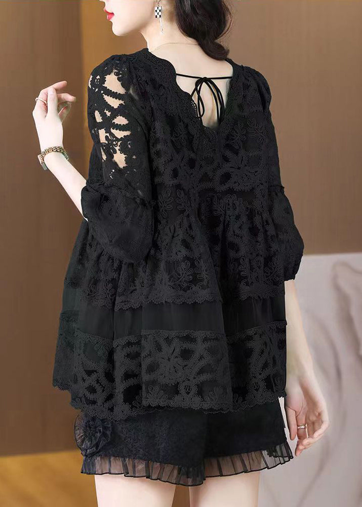 V Neck Casual Black Tulle Embroidered Shirt Bracelet Sleeves