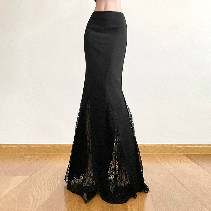 Vintage Black High Waisted Gauze Pleated See-Through A-Line Lace Skirt