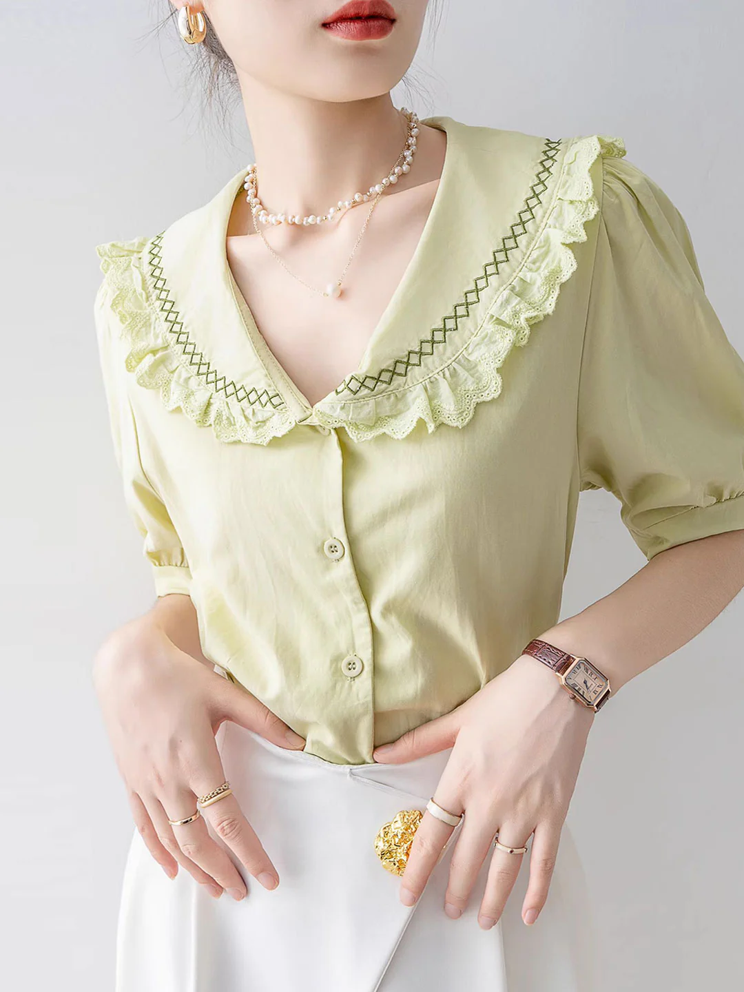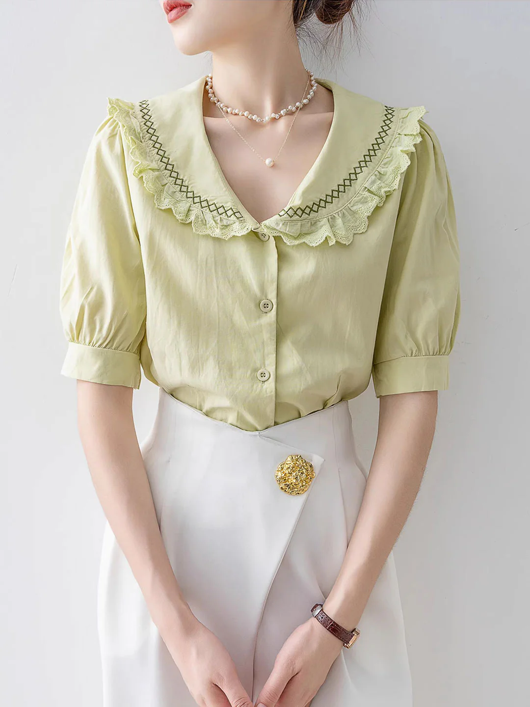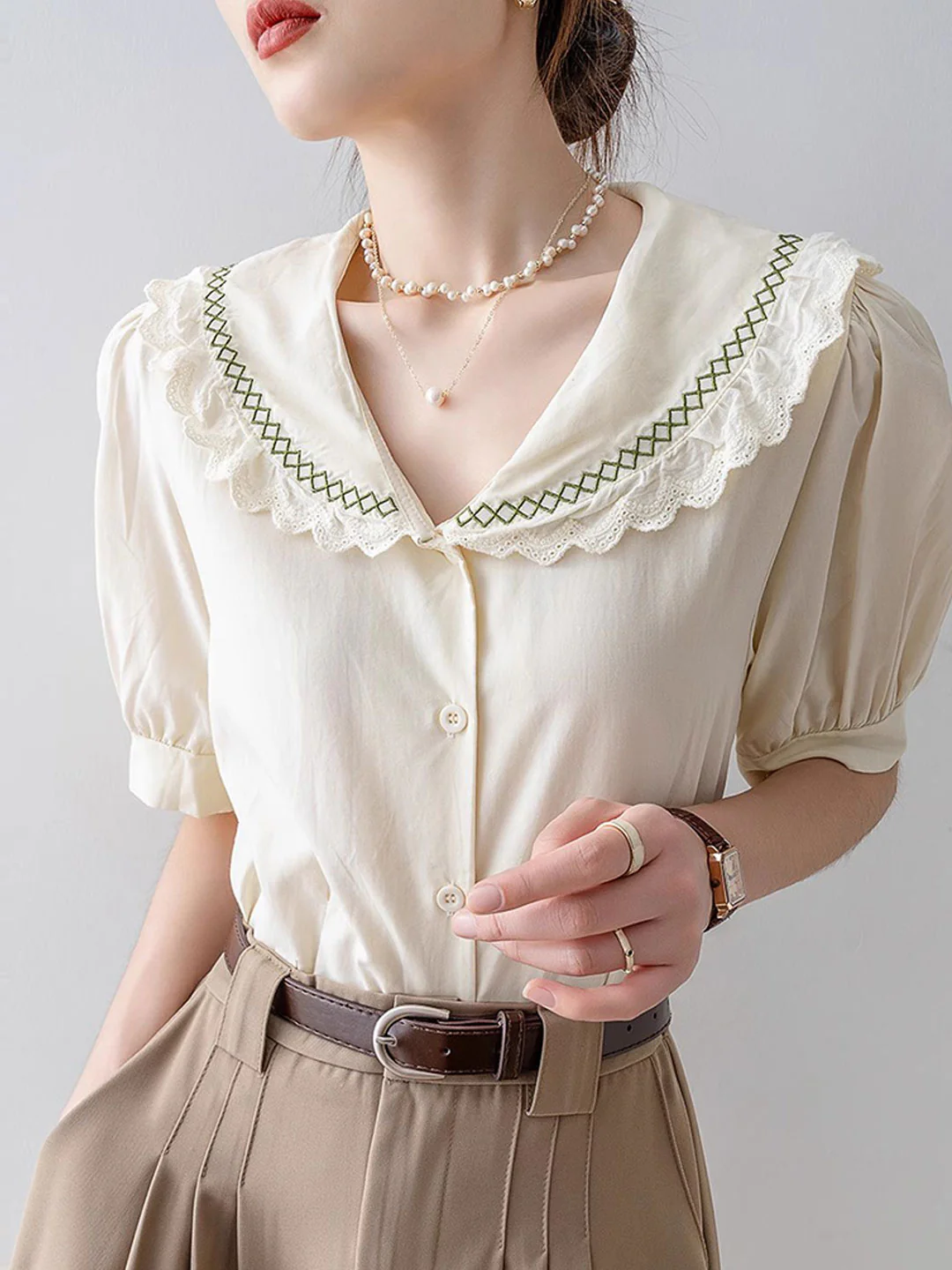 Vintage Lapel Neck Embroidered Lace Short Sleeve Blouse Top