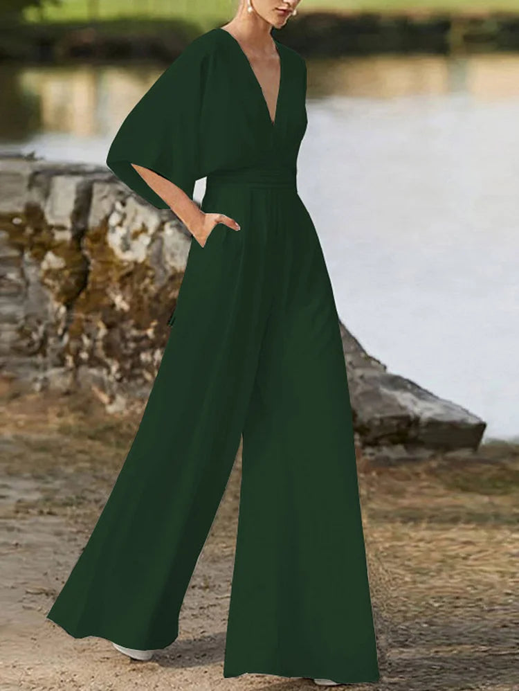 White Elegant Deep V Neck Plain Half Sleeve High Waist Wide Leg Jumpsuit