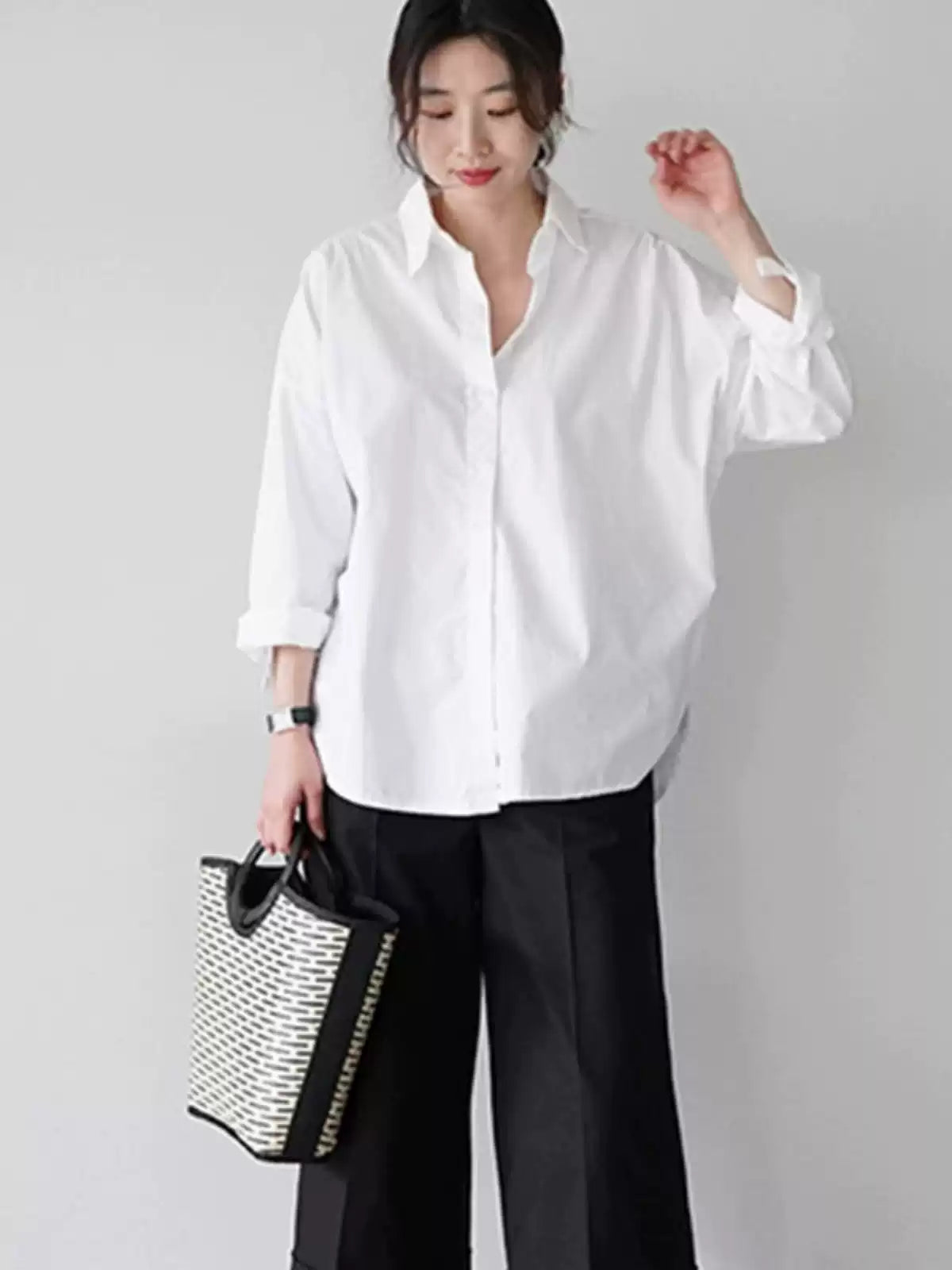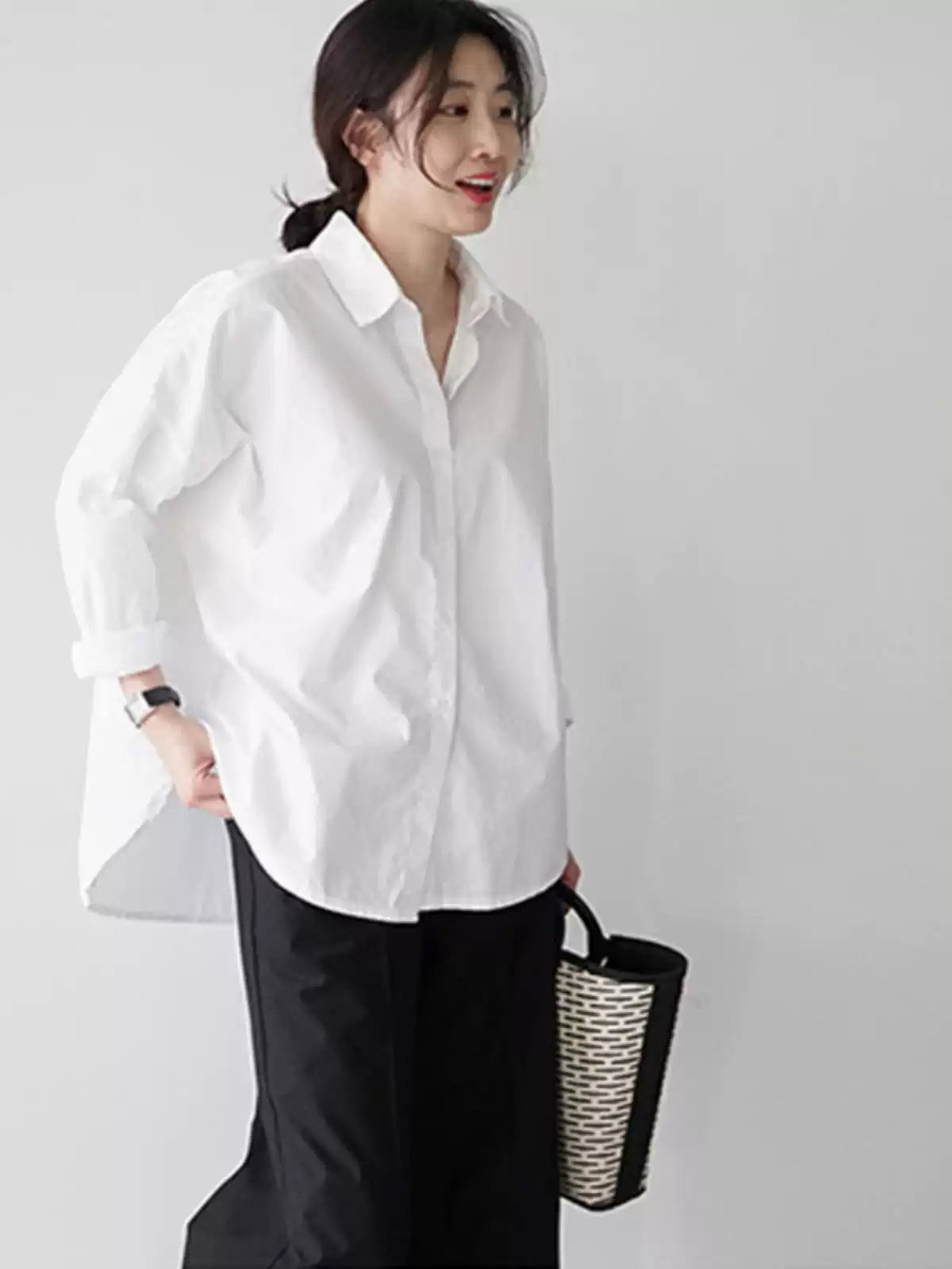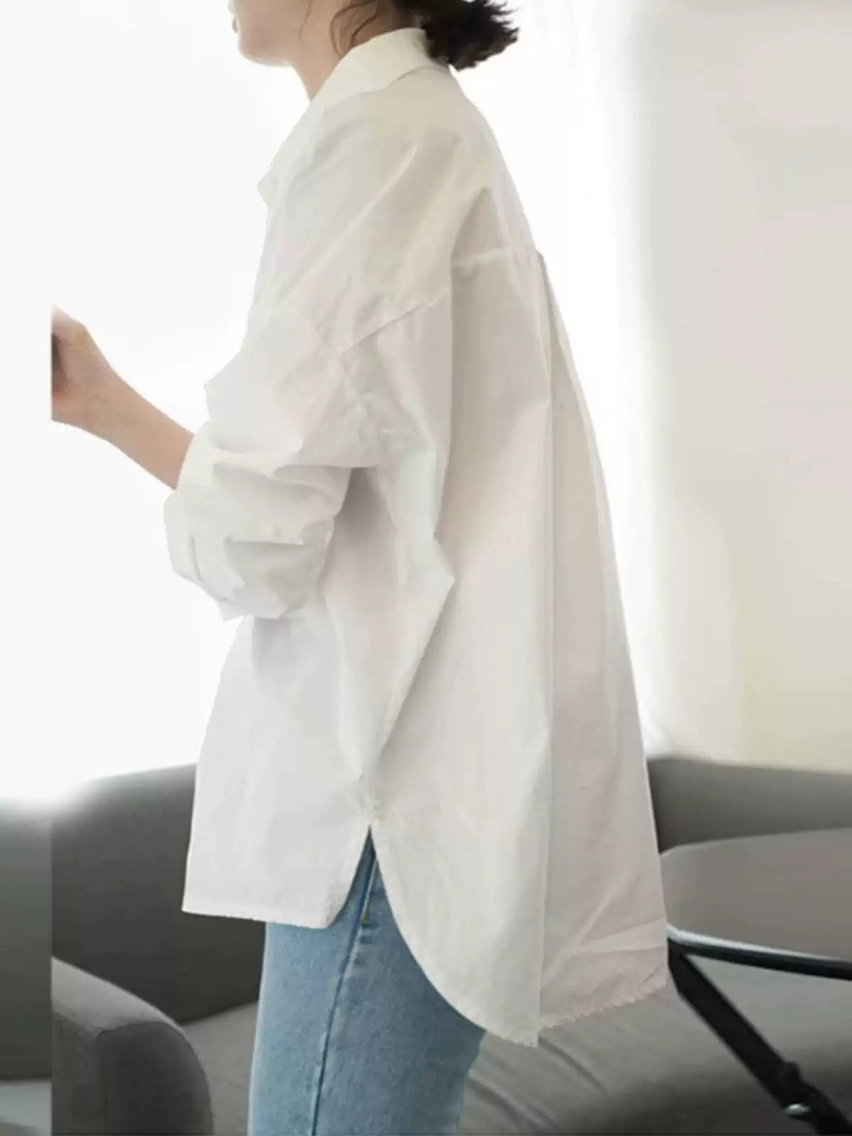 White Oversized Cotton Shirt Peter Pan Collar Pocket Fall