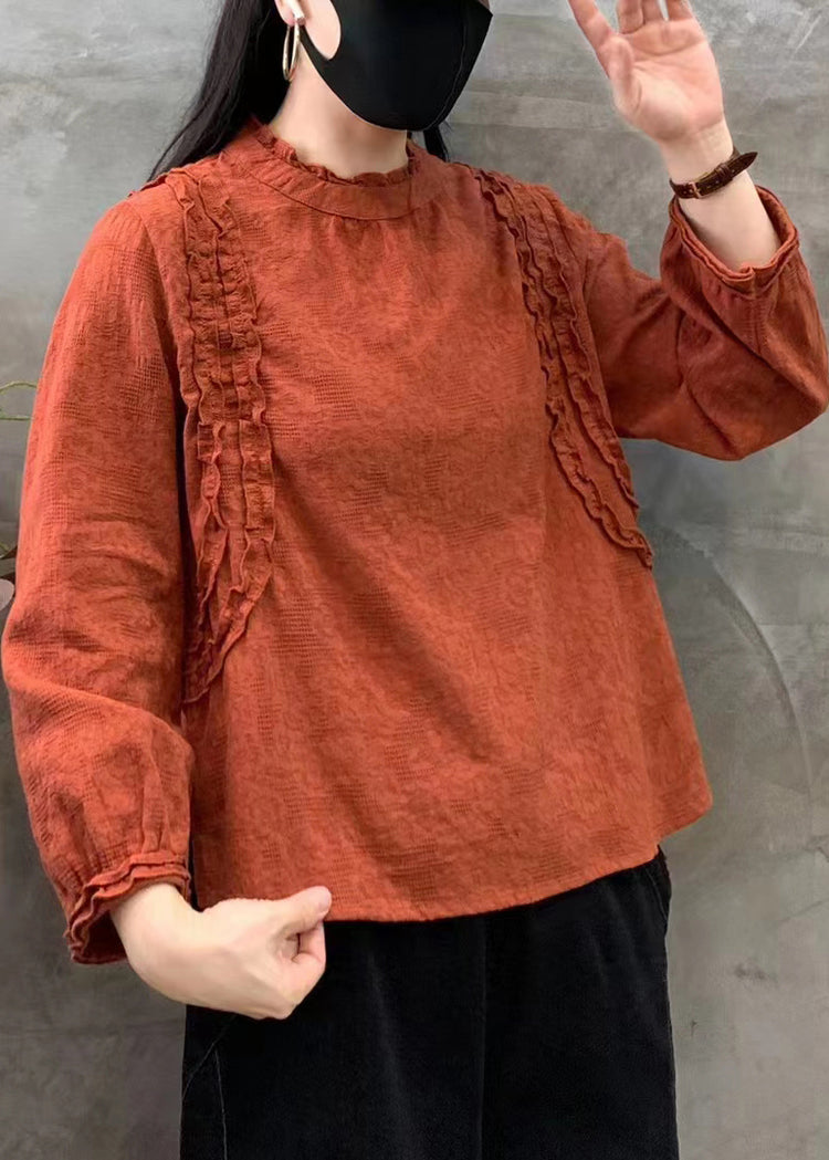 Women Orange O-Neck Ruffled Patchwork Cotton Tops Fall