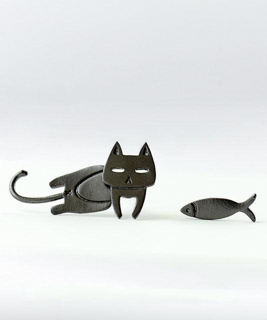Women Stylish Cat and Fish Asymmetrical Design Metal Stud Earrings